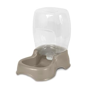 Petmate cafe waterer is a gravity waterer that's easy to clean and refill. Utilizing PET plastic bottles with recessed handle areas for easy lifting. Non skid rubber feed maintain it in place. Let's your dog drink anytime. 3/4 gallon capacity for medium pets, Pearl Tan color